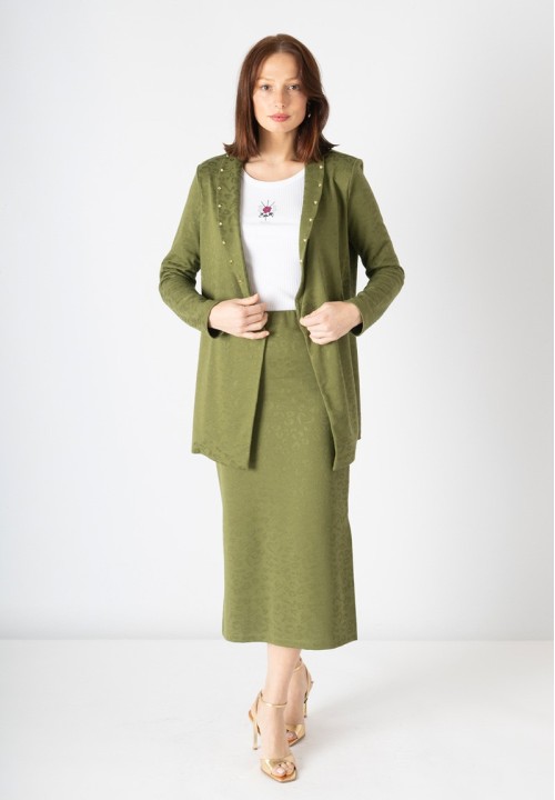 Chaqueta verde con un sutil animal print exclusivo de la marca. Recuerda que "El coraje no siempre ruge. A veces es la voz tranquila al final del día que dice: 'Lo intentaré de nuevo mañana”. " – Mary Anne Radmacher